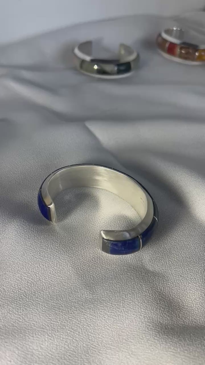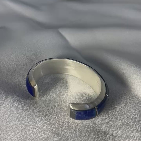 This hand-fabricated sterling silver cuff features a high-grade lapis lazuli inlay, offering a striking combination of craftsmanship and natural beauty. Designed to fit a medium wrist comfortably, it provides both elegance and durability, making it a refined accessory for those who appreciate expert artistry and timeless style.